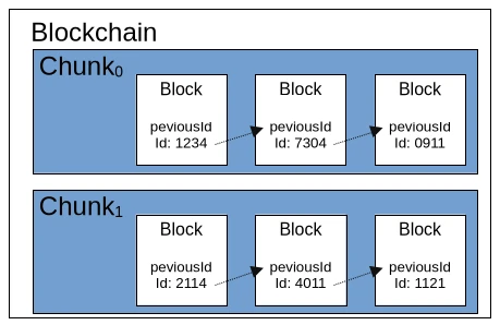 We’ve now learned a considerable amount about the ruleset for a blockchain. So it’s time to consider performance. If we were to simply store all the individual blocks of the blockchain in a list, we would quickly run out of memory. While it’s possible to store the blocks in a local database, this would negatively impact the blockchain’s speed, even with an embedded solution like SQLite. A simple solution would be to divide the blockchain into equal parts, called chunks. A chunk would have a fixed length of 2048 valid blocks, and the first block of a new chunk would point to the last block of the previous chunk. Each chunk could also contain a central rule for the nonce and store metadata such as minimum and maximum timestamps.