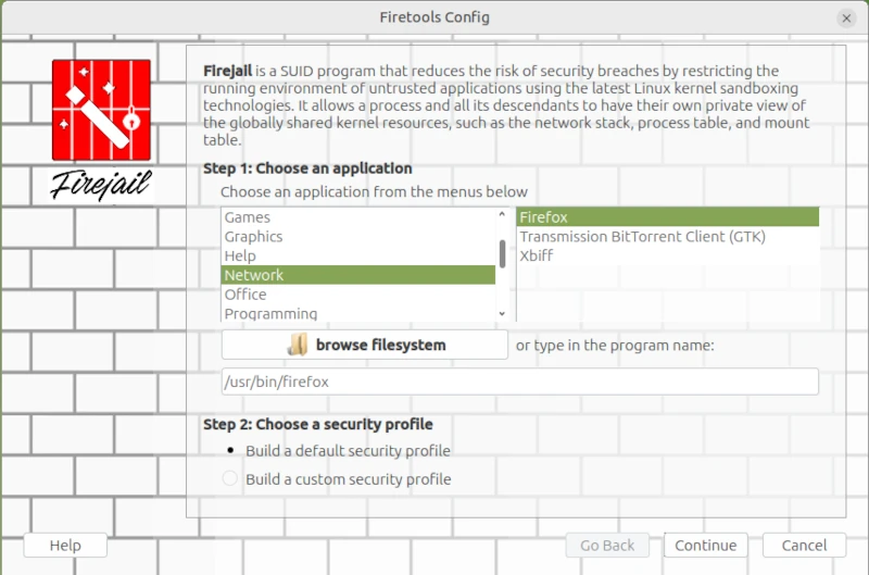 Usage: firejail [options] [program and arguments]I started the Firejail Configuration Wizard via the application menu.