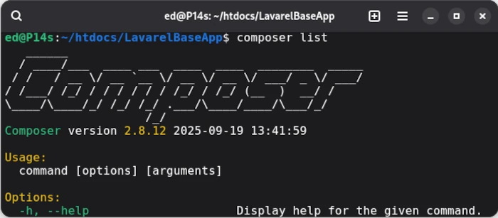 If everything was executed correctly, composer list should now display the version, including the available commands. If this is the case, we can install the Lavarel installer globally in the Composer repository.